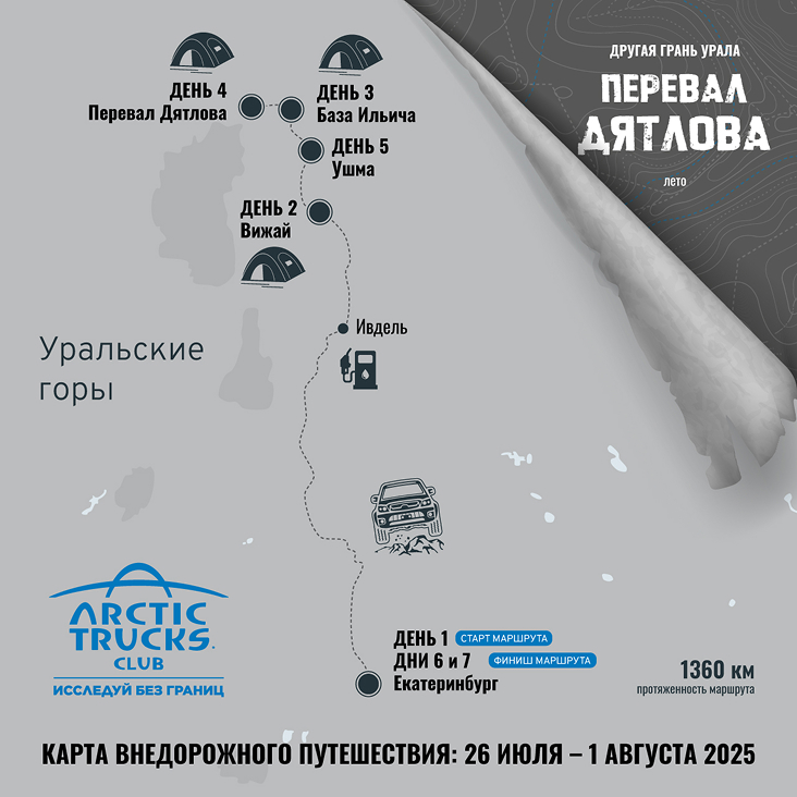 Сегодня мы подходим к главной точке маршрута. Маршрут узкий, неровный, проложенный экспедиционными машинами — здесь пригодятся всё: и грамотное вождение, и подготовка техники, и терпение. К середине дня — палаточный лагерь на перевале Дятлова. Осмотрим мемориала и погрузимся в атмосферу, которую не передать словами.