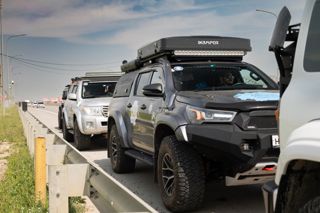 Экспедиция проходила на подготовленных автомобилях Arctic Trucks, модифицированных под подобные маршруты. Все машины уверенно справлялись с погодными вызовами, дождями, бездорожьем и горными серпантинами. Навигация работала стабильно. Никакой романтики «потеряться в горах» — только точный маршрут, грамотная координация и спокойная уверенность на каждом участке пути.